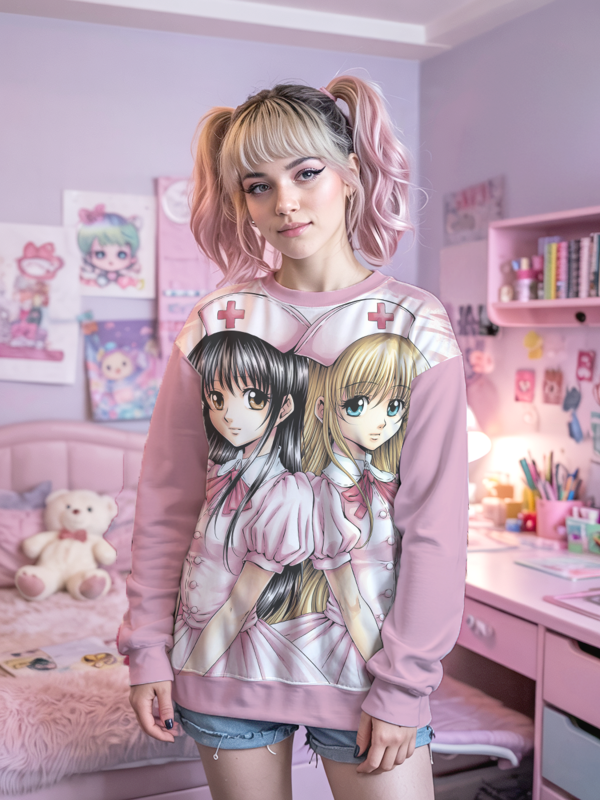 A dose of kawaii! A striking pastel pink pullover featuring detailed anime art of twin nurse girls in classic puff-sleeved uniforms, oversized bows, and soft blush tones. Their expressive manga-style eyes make this a wearable piece of otaku art.