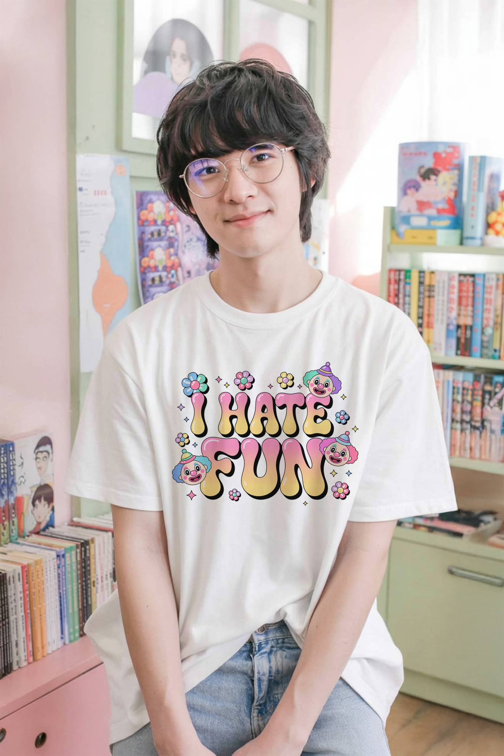 Add some irony to your wardrobe. Featuring vibrant pastel lettering, cheeky clown faces, and kawaii-inspired flowers, this shirt is perfect for lovers of all things weird, whimsical, and wonderfully sarcastic. Whether you’re into clowncore or just want to confuse everyone at the party—this tee has got your back.