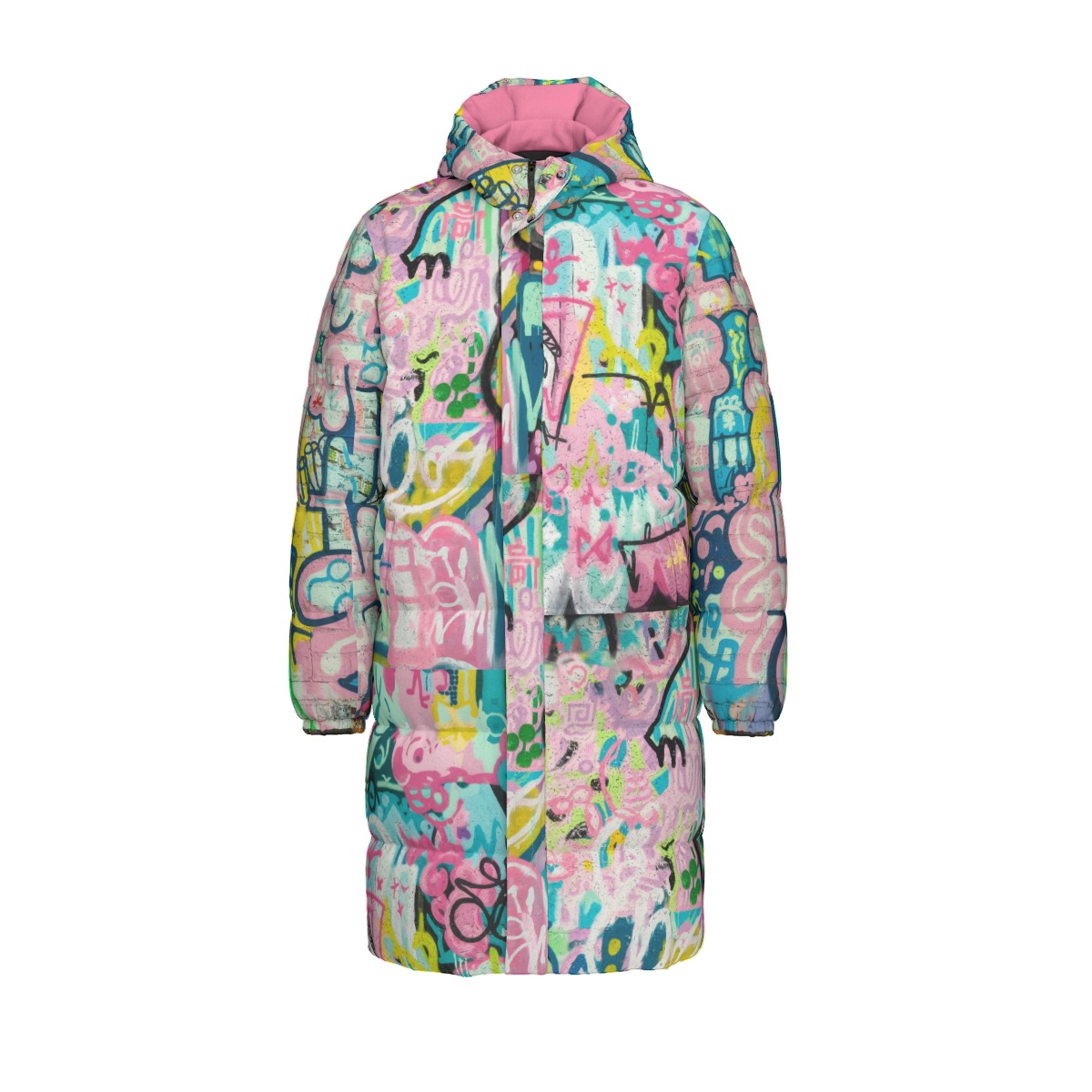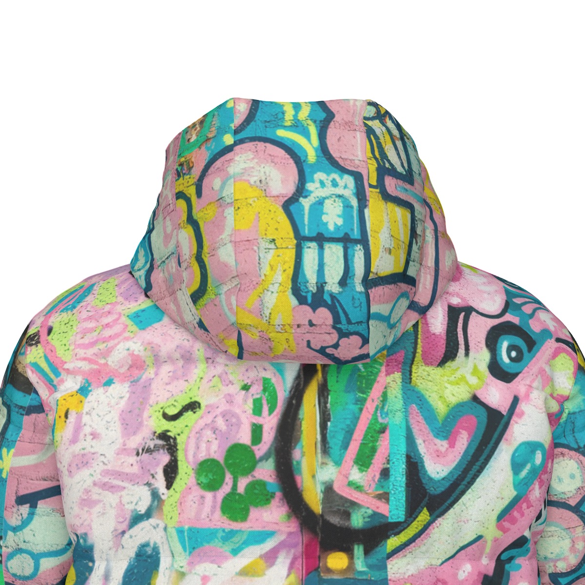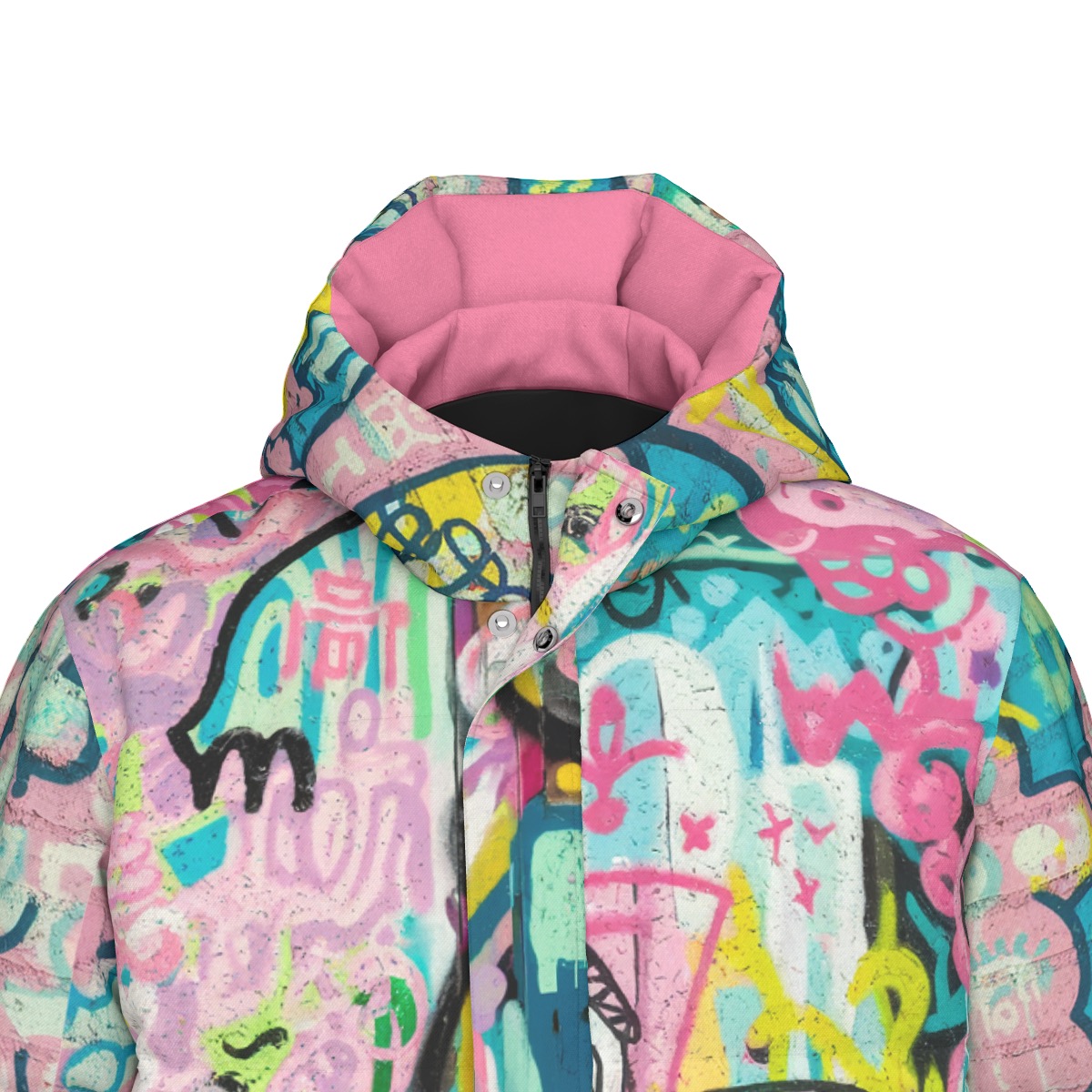 Wrap yourself in a walking daydream with this graffiti-pastel puffer — a coat that looks like someone bottled the energy of a street mural and then dipped it in cotton candy clouds. Splashes of bubblegum pink, electric teal, lime scribbles, and doodled symbols layer together like a chaotic love letter to color. It’s cozy, oversized, and proudly loud.