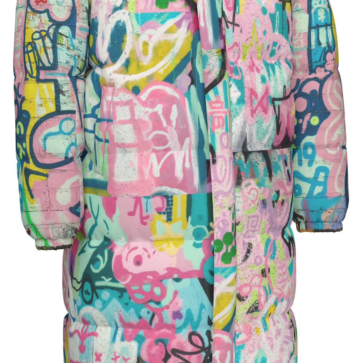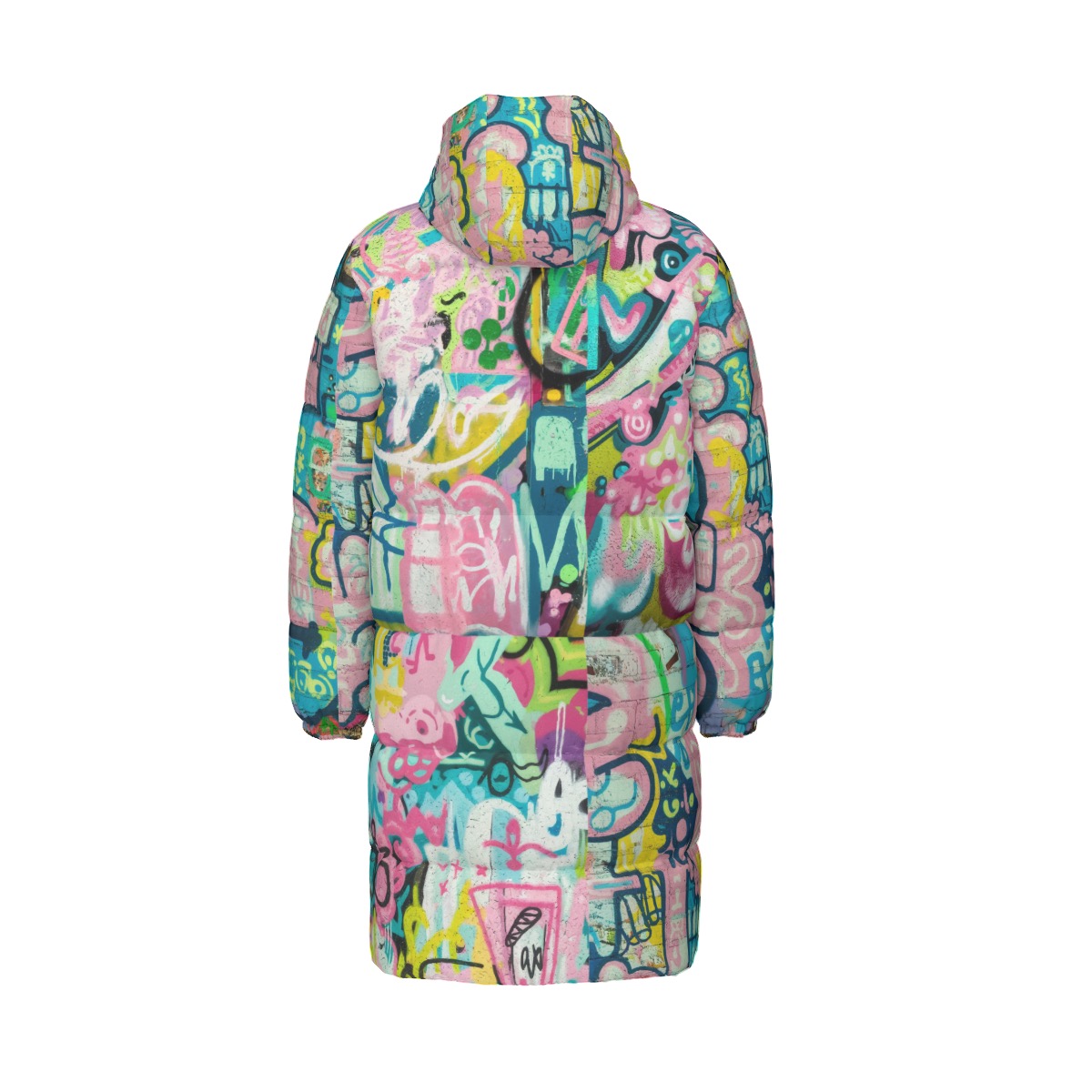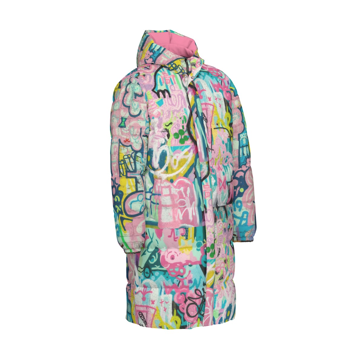 Wrap yourself in a walking daydream with this graffiti-pastel puffer — a coat that looks like someone bottled the energy of a street mural and then dipped it in cotton candy clouds. Splashes of bubblegum pink, electric teal, lime scribbles, and doodled symbols layer together like a chaotic love letter to color. It’s cozy, oversized, and proudly loud.