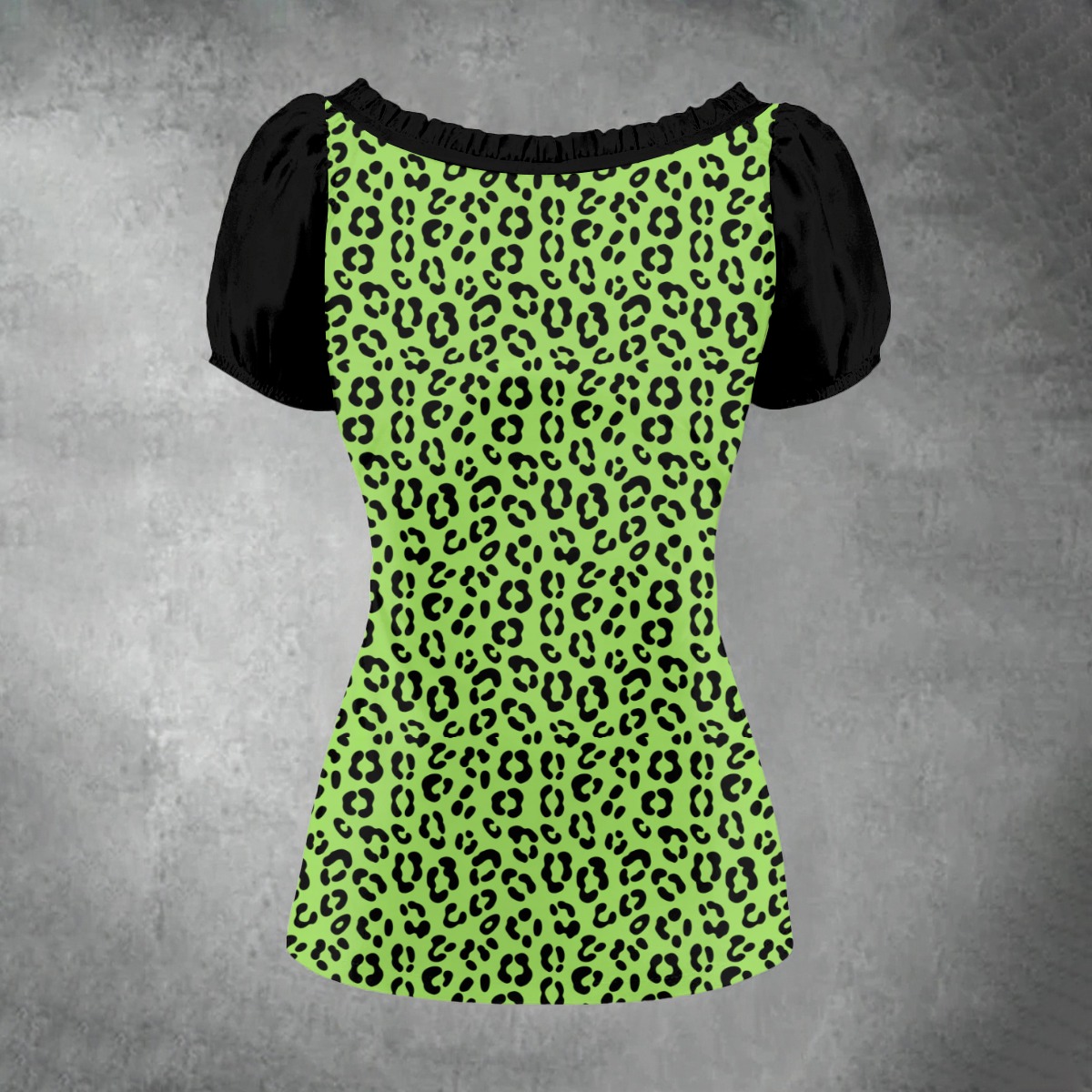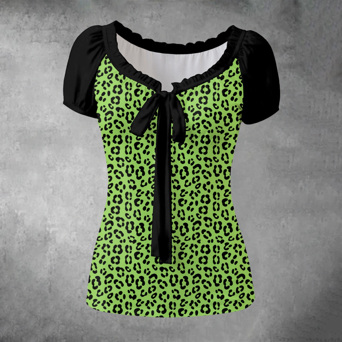 Neon green leopard meets soft black sleeves in this flirty Y2K-inspired top that feels straight out of an 2000s pop video. The tie-front neckline frames the collarbone just right, adding a playful edge without trying too hard.