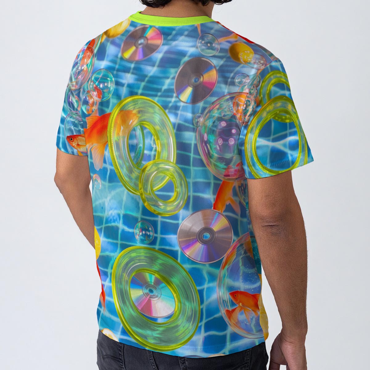 Step into a dreamy digital world with this eye-catching, surreal shirt! Featuring a vibrant aquatic design with floating CDs, bright green orbs, goldfish, and neon reflections over a shimmering blue pool background, this shirt embodies nostalgic 2000s aesthetics with a futuristic twist.