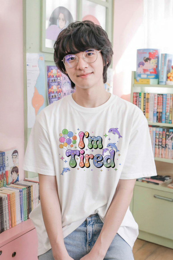 This “I’m Tired” tee blends soft pastel graphics with cute dolphins, balloons, and sparkly details, giving it that gentle kidcore mood while still saying exactly what you mean.
