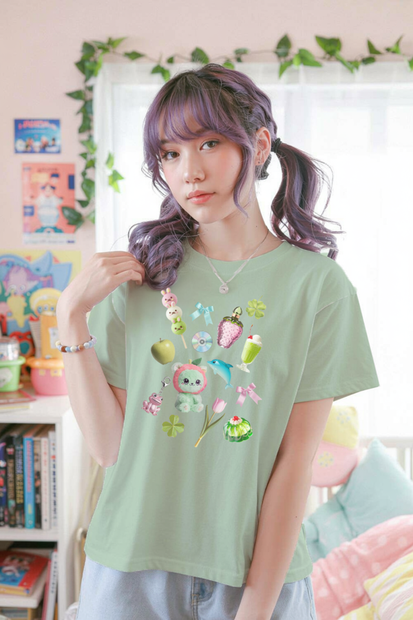 A playful mashup of pastel dreams, childhood nostalgia, and cozy collectible vibes. Adorned with an eclectic mix of tiny treasures—from a dolphin charm and vintage CD to a green matcha float, bows, strawberries, and a plushie bear—this tee is a tribute to everything cute and chaotic in the best way.