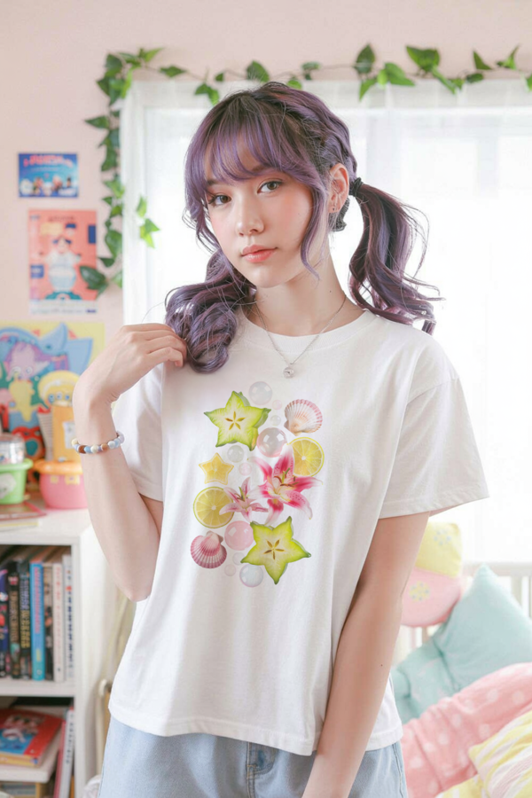 Featuring a colorful design of juicy starfruit, lemon slices, pink lilies, scallop shells, and whimsical bubbles, this dreamy tee captures the carefree, playful essence of summer. It’s perfect for fans of Y2K fashion, kawaii styles, and everything tropical and cute.