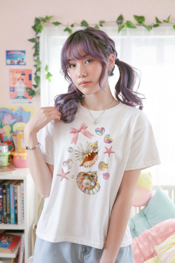 Add a splash of whimsy to your wardrobe! Featuring a stunning design of iridescent seashells, shiny pearls, starfish, pastel hearts, and a soft pink bow, this tee brings sweet ocean vibes straight to your everyday style. Perfect for lovers of juminocore, kawaii, and ocean aesthetics.