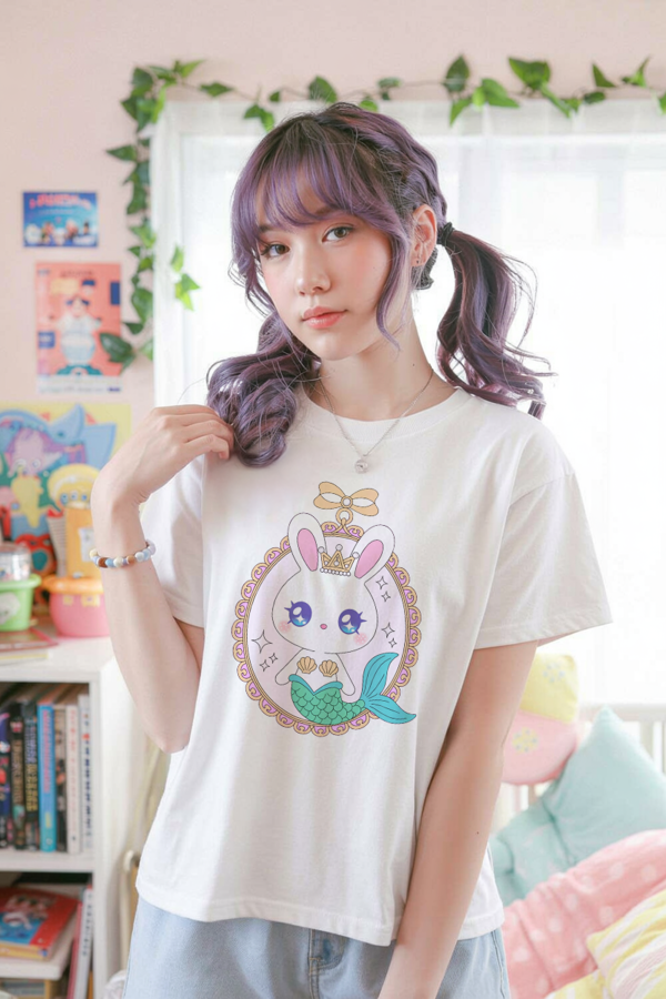 Featuring a dreamy bunny-mermaid print framed with pastel shells, sparkles, and a tiny crown, this shirt is perfect for fans of kawaii, kidcore, and soft pastel fashion.