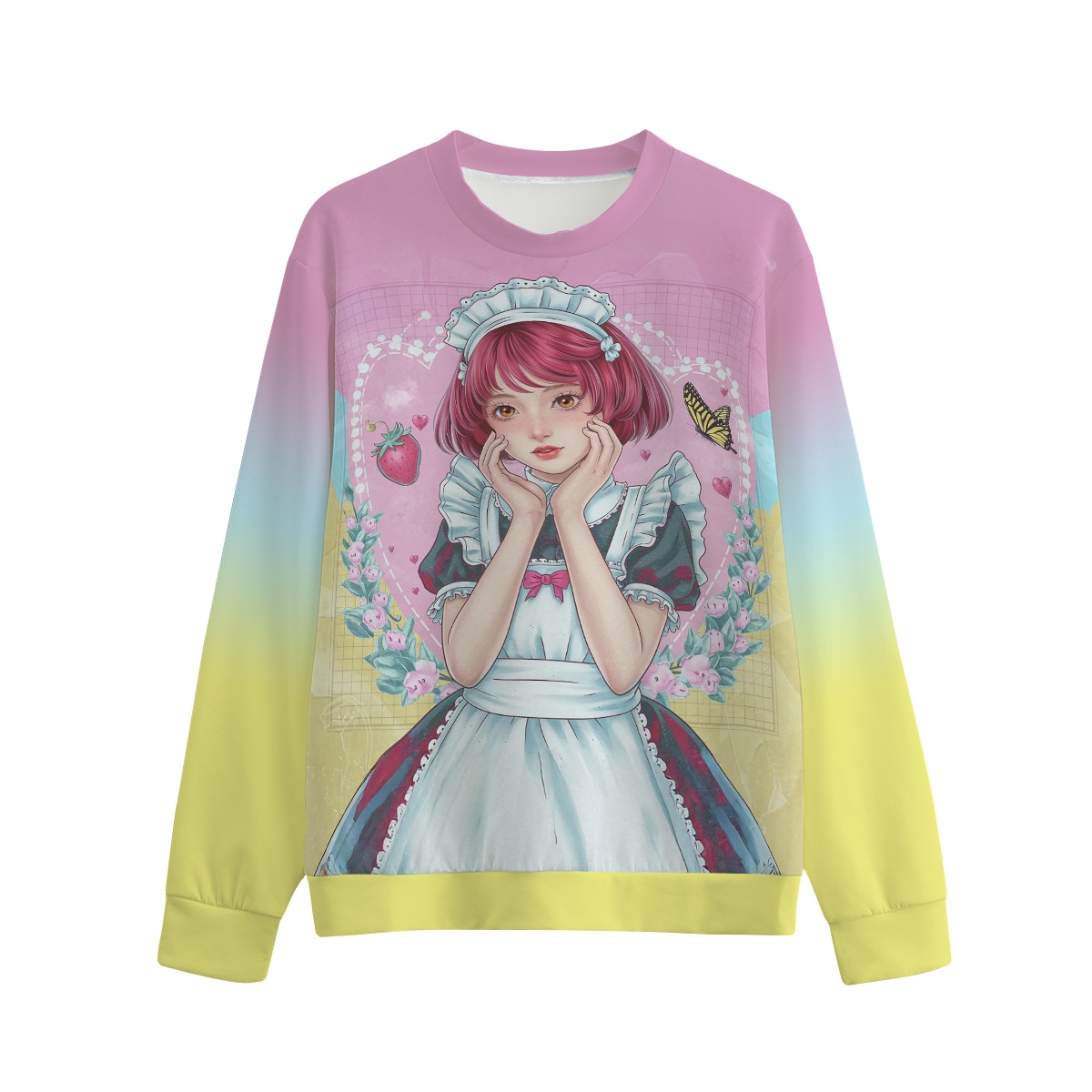 Step into a fairytale cafĂ©! Featuring a beautifully illustrated anime-style maid girl with soft pink bobbed hair, dreamy eyes, and a ruffled apron, this piece is framed by strawberries, butterflies, florals, and heart detailsâset against a magical ombrĂ© background that fades from lavender to sunshine yellow đ