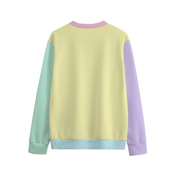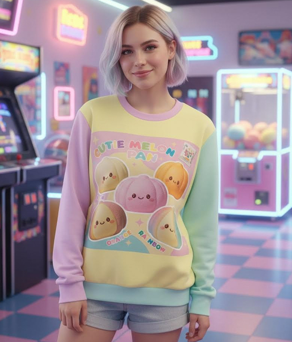 With pastel color-blocked sleeves in lavender, mint, butter yellow, and baby blue, this sweatshirt is a full-on pastelcore dream—perfect for lovers of kawaii fashion and soft aesthetic vibes.