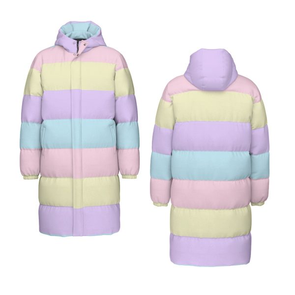 Pastel stripes turn this down jacket into a soft, dreamy statement piece. The aesthetic puffy coat has a warm, cloud-like feel, wrapped in a palette straight from fairy kei and yume kawaii. Think of it as a wearable marshmallow made for cold days — a pastel puffer that fits right into kidcore moods and cozy kawaii winter outfits. A bright jacket for anyone who loves gentle colors and playful layering.