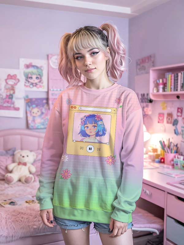 Now playing: pure aesthetic vibes. A dreamy pastel gradient pullover featuring a sweet blue-haired anime girl framed in a faux streaming player window—complete with play button, progress bar, and kawaii daisy accents. The soft ombré blends pink, lilac, and mint green for a digital-meets-daisy-daydream look.