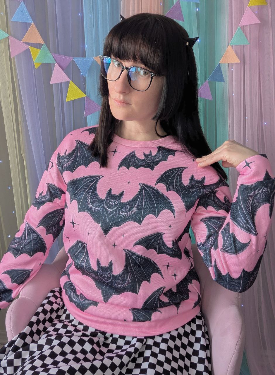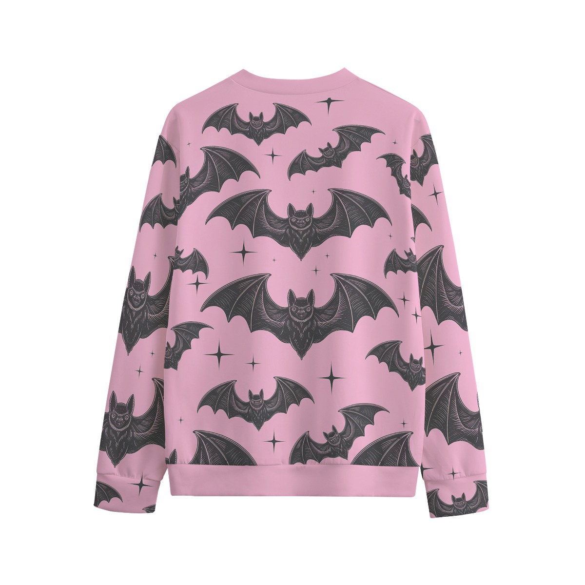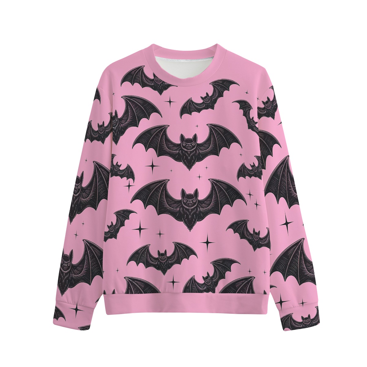 Calling all night creatures and pastel goths! This sweatshirt brings a moody twist to your kawaii wardrobe. Featuring an all-over print of vintage-style flying bats and black starbursts on a soft pink backdrop, this sweatshirt is the perfect balance of spooky and sweet.