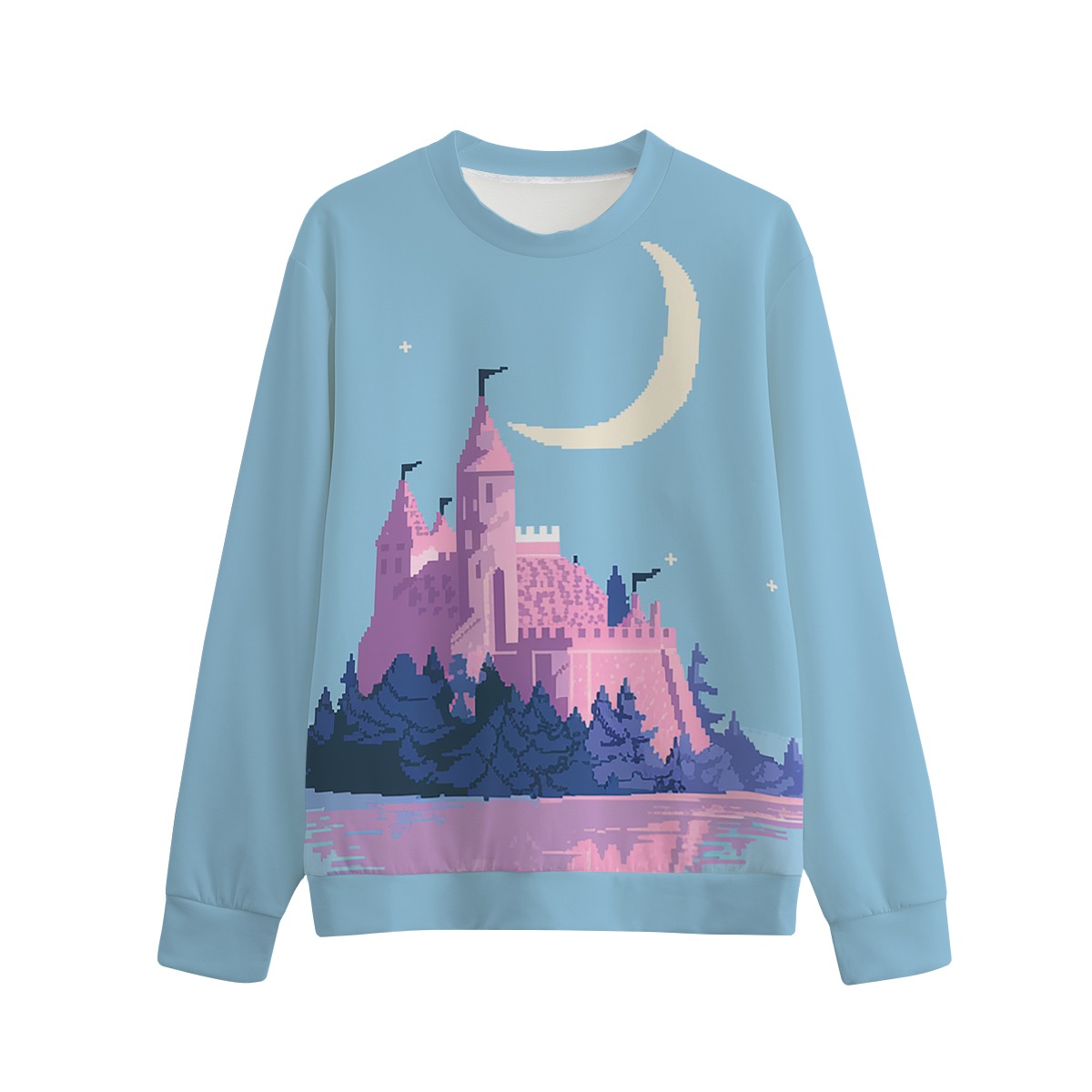 This sweatshirt brings together soft pastels and retro pixel art in a calm, slightly nostalgic way. The pixelated castle and crescent moon give it that gentle yume kawaii and fairy kei feel without being overly sweet.
