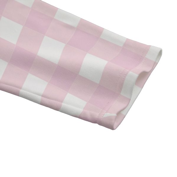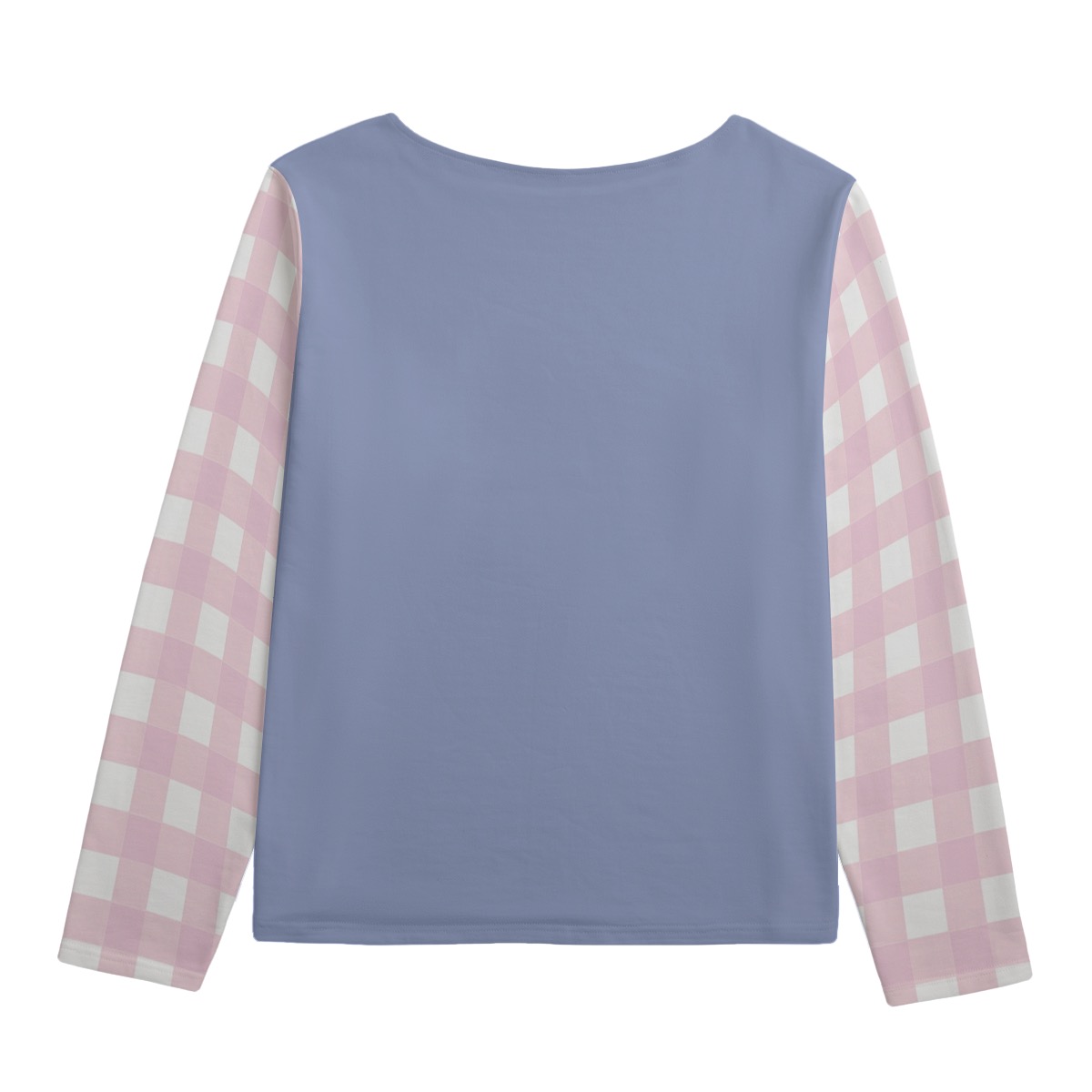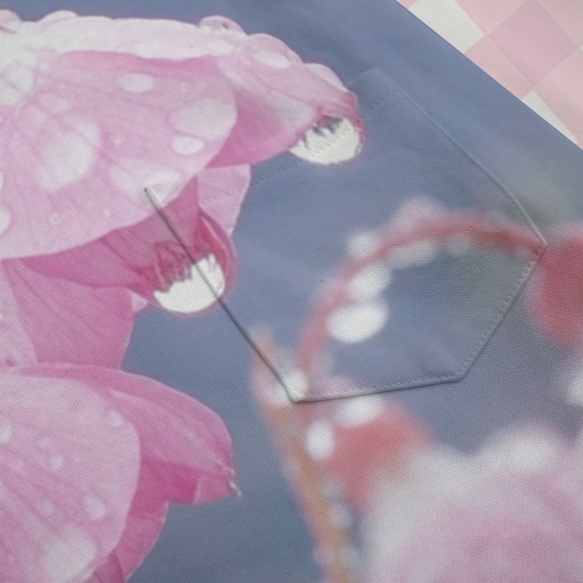 Pink Bell Flower Lounge Set featuring a soft long sleeve top and matching bottoms with delicate floral print, pastel gingham sleeves, and dreamy raindrop details. This aesthetic two-piece outfit blends cottagecore charm with everyday comfort.