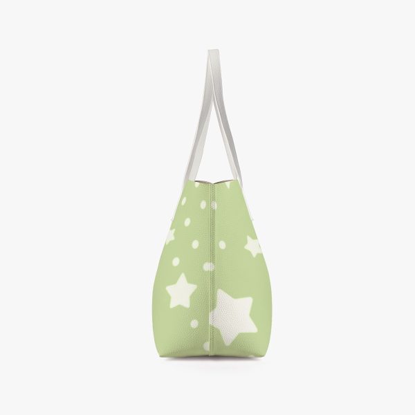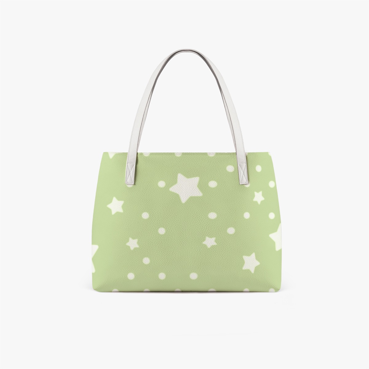 Soft pastel green tote bag featuring an all-over white star and polka dot print. Minimalist yet playful design with sturdy shoulder straps. Lightweight, roomy, and perfect for daily use, shopping, school, or casual outings. Ideal for kawaii, pastel, soft girl, and Y2K-inspired looks.