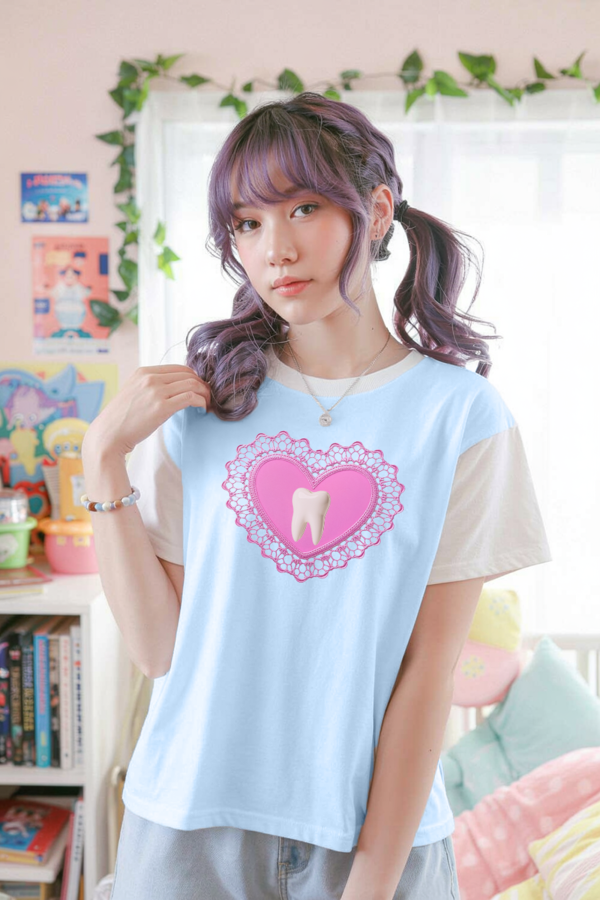Add a touch of quirky cuteness to your wardrobe! Featuring a pink lace heart with a detailed tooth graphic, this design is a perfect mix of pastel aesthetic, yami kawaii, soft grunge, and Y2K vibes. The baby blue and white color block style makes this tee playful, nostalgic, and eye-catching—ideal for those who love unique fashion with a fun twist!